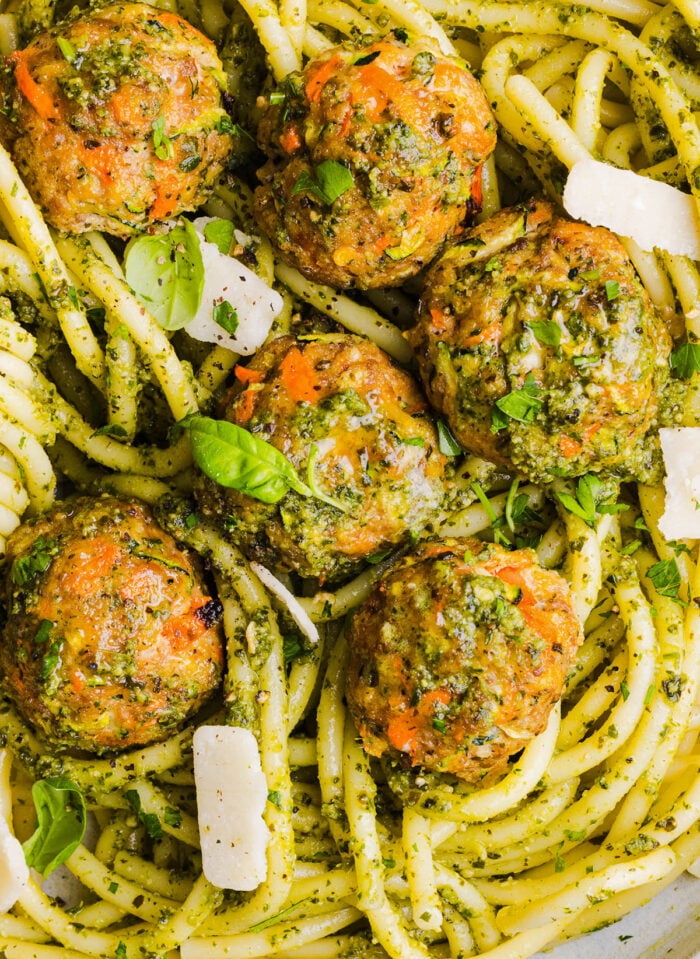 • Healthy – we are using lean ground chicken which stays juicy thanks to the pesto along with the addition of shredded carrots and zucchini! These meatballs are also baked, not fried.