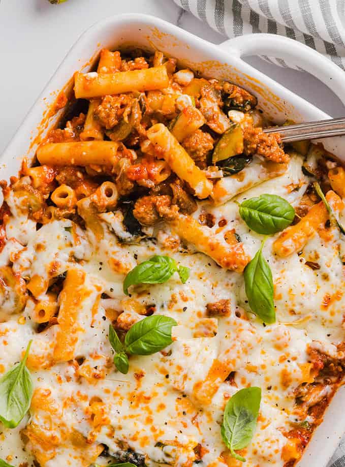 This comforting and delicious Healthy Baked Ziti recipe is packed with fresh veggies, flavorful turkey sausage and makes the perfect weeknight meal the whole family will love! Leftovers are guaranteed!