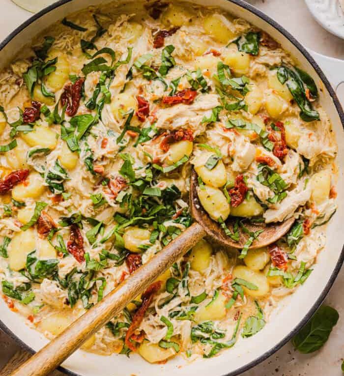 - Rich and creamy – pillowy soft potato gnocchi and tender chicken all simmered together in a creamy sauce full of garlic, parmesan and sun-dried tomatoes.