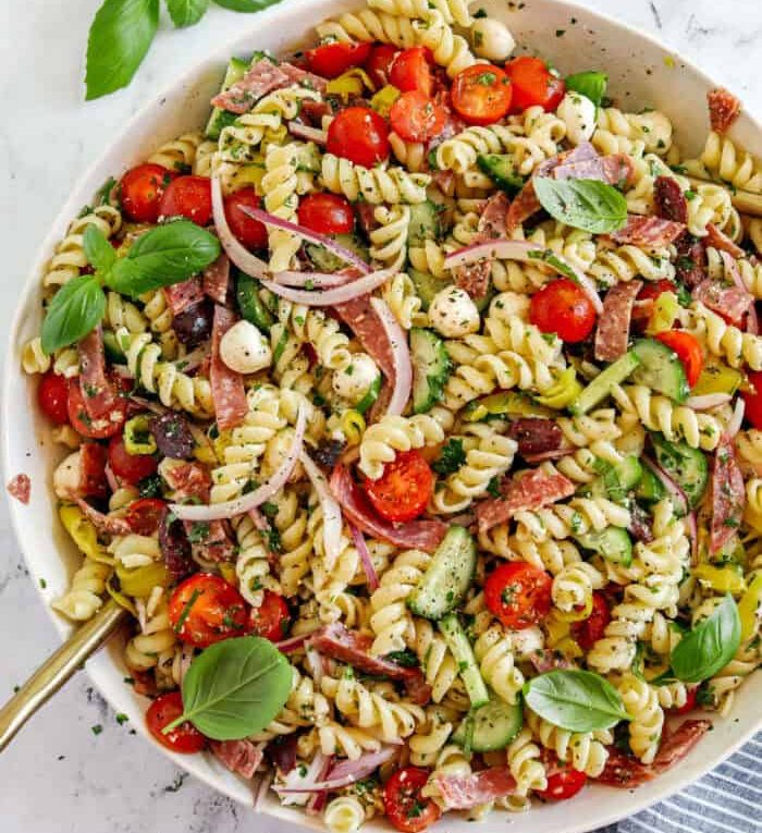 This EASY Italian Pasta Salad is loaded with juicy tomatoes, cucumbers, fresh mozzarella, spicy salami, pepperoncini, red onion and olives