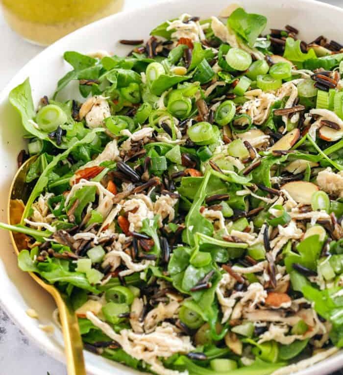 Continue readingHearty and delicious Wild Rice Chicken Salad made with leafy arugula, warm wild rice, shredded chicken, sliced almonds, and green