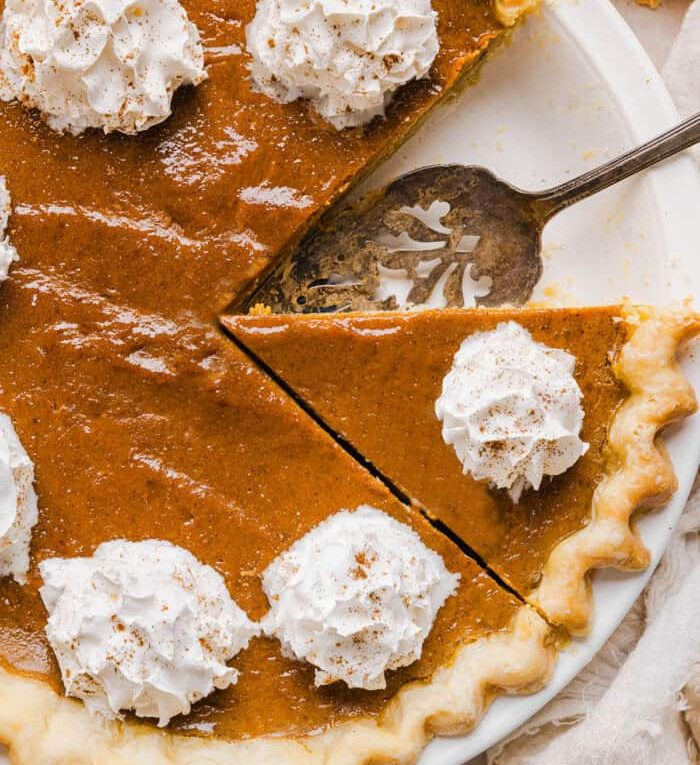 To Freeze: You can either wrap the whole pie tightly with plastic wrap along with a layer of foil or you can freeze individual slices for grab-and-go convenience! Pumpkin pie will last up to 2 months in the freezer. When ready to enjoy, let the pie thaw overnight in the fridge before serving.